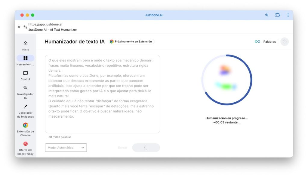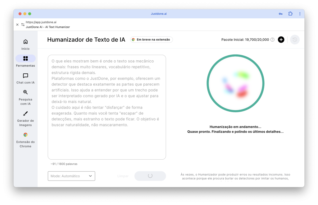 O humanizador do JustDone é útil justamente aqui: ele ajuda a ajustar a fluidez, aproximar o texto do estilo que você realmente usa e deixar tudo menos robótico — seja para LinkedIn, um relatório de estágio ou um artigo de blog.